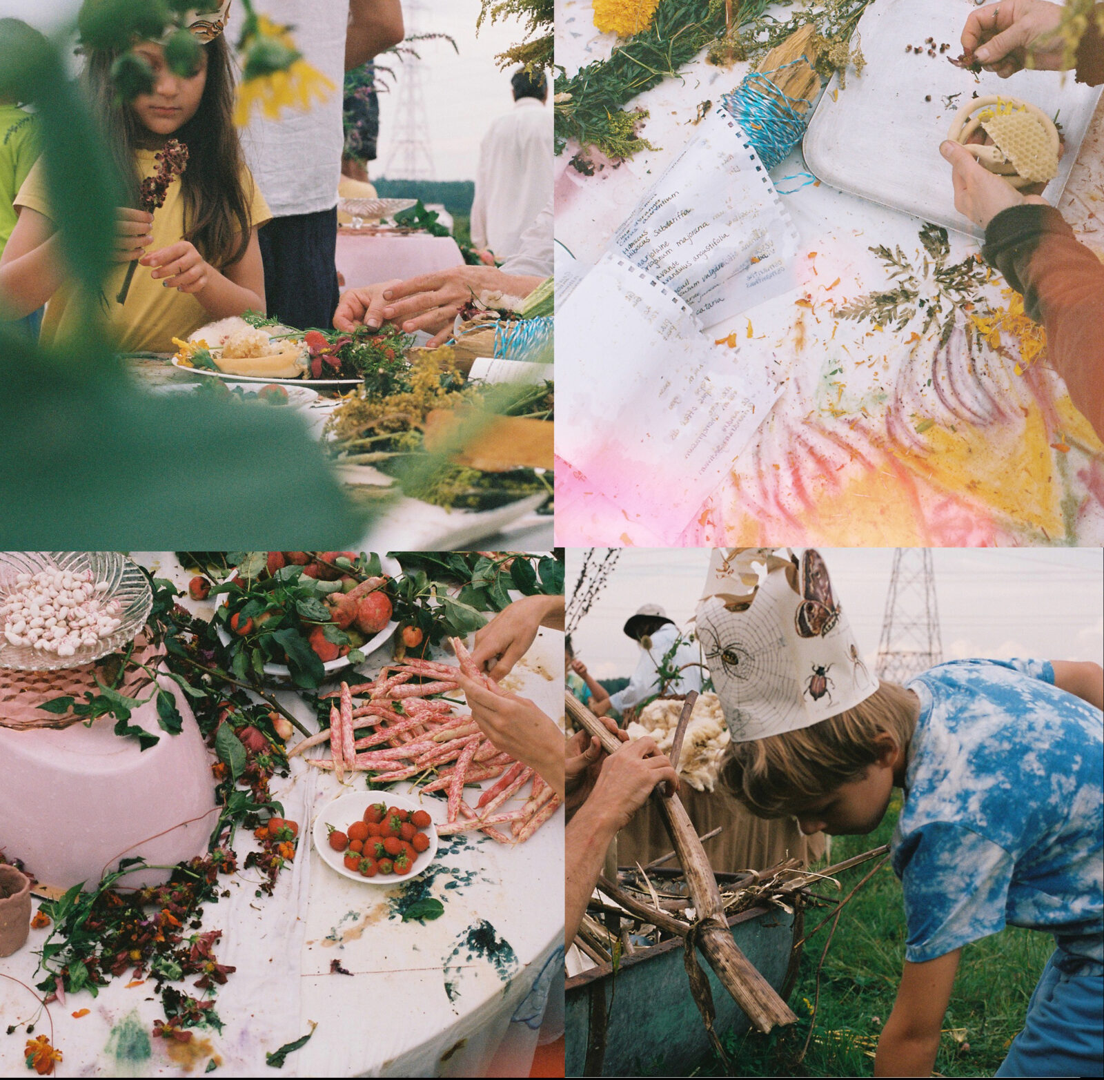 De la terre à la table célèbre les savoir-faire alternatifs et les relations que les producteur·rices agricoles de la région entretiennent avec les vivants et les écosystèmes dans le cadre de leur travail. Le projet fait suite à la résidence de création de la famille Carrier-Bouchard avec Vrille art actuel à la Ferme 40 Arpents, qui a eu lieu à l’été 2024. Durant ce séjour, les artistes sont allé·es à la rencontre des producteur·rices du milieu agricole et culturel de la région, et les ont invité·es à participer à une performance collective. Les photos grand format présentées sur des sites agricoles à travers le Kamouraska sont des traces de ces échanges créatifs. Le groupe familial a pris soin d’intégrer au projet l’imaginaire des enfants qui étaient présents, un élément important imbriqué à leur pratique.